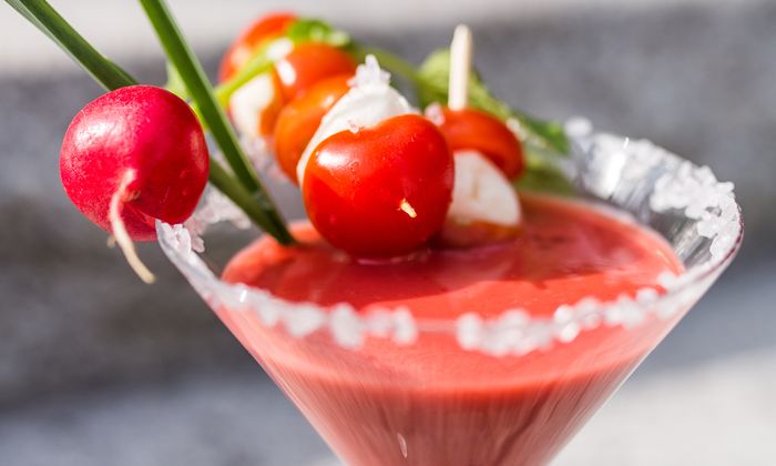 - Guarnire il bicchiere con la salsa di pomodoro, la decorazione e i bastoncini.