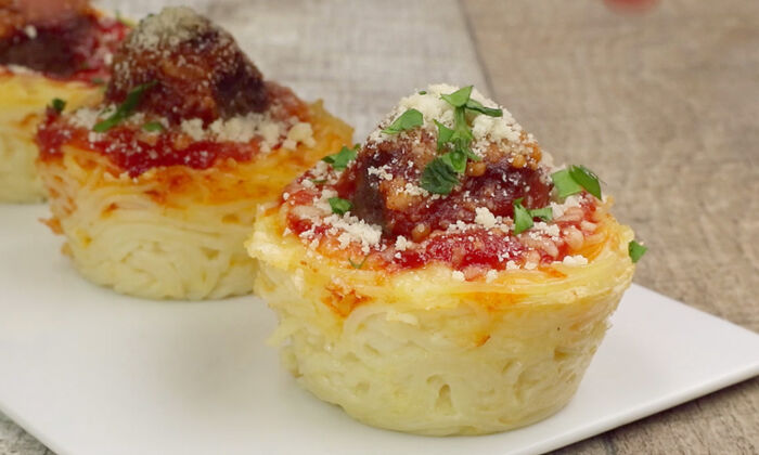 - Naturalmente, per questo piatto si cucinano anche gli spaghetti, che vengono poi mescolati con il formaggio per pizza e pasta GOLDSTEIG. Poi si porzionano con forchetta e cucchiaio in modo che gli spaghetti entrino negli stampi per muffin.