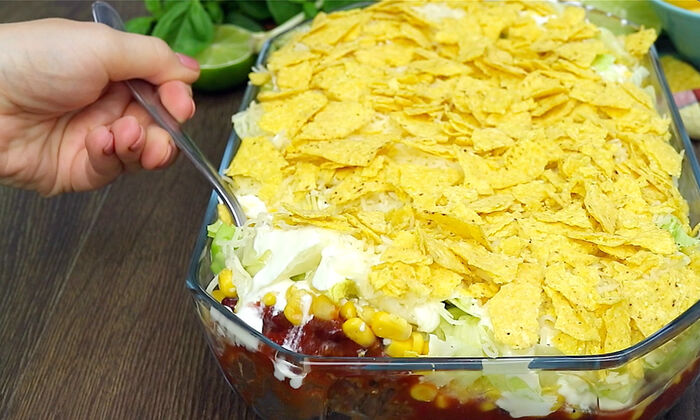 - Quindi, fare uno strato con la salsa, i fagioli, il mais e metà della panna acida.