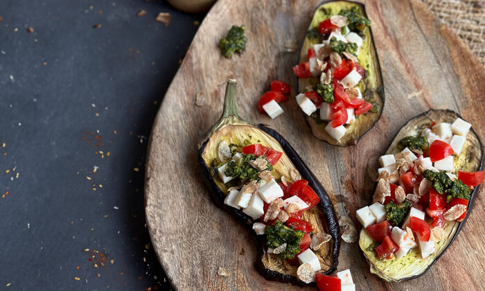 - Spennellare entrambi i lati delle fette di melanzana tagliate sottili con un po' di pesto e infornare su una teglia per circa 15 minuti.