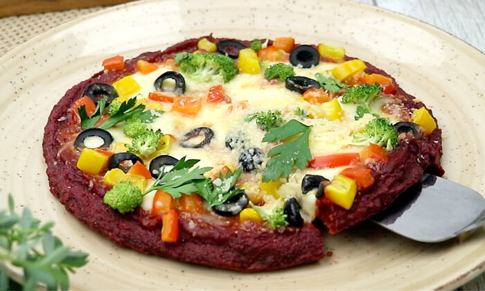 - Per prima cosa tritare grossolanamente la barbabietola in un frullatore, quindi mescolarla con la farina di ceci, la farina di mandorle, il lievito, il sale, l'uovo e l'olio di cocco per formare un impasto uniforme. Assicurarsi che tutti gli ingredienti siano tritati finemente. Versare l'impasto in una teglia per pizza rivestita di carta da forno, stenderlo uniformemente e cuocere in forno a 180 °C per 25 minuti.