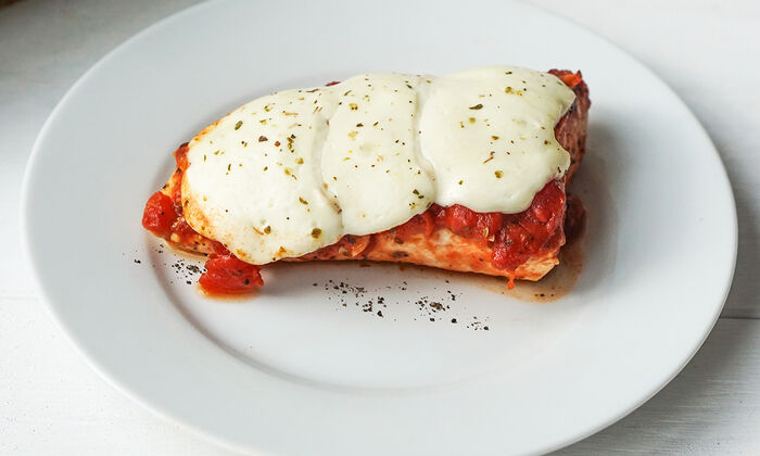 - Cuocere per 20 minuti. Disporre le fette di Protinella GOLDSTEIG sopra i pezzi di pollo e cuocere per altri 5 minuti.