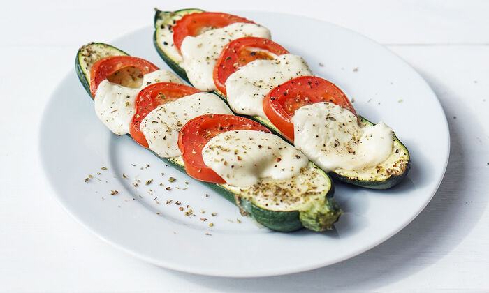 - Togliere le zucchine dal forno e alternarle con i pomodori e la Protinella GOLDSTEIG. Cospargere con sale, pepe e origano secco e infornare per altri 12-13 minuti.